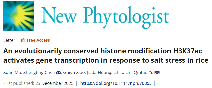 近日,作物遗传育种专业马瑄博士与中国水稻所陈正庭博士及广西大学徐秋涛教授团队合作,在植物学TOP期刊New Phytologist (5年平均影响因子10.3) 在线发表题为“An evolutionarily conserved histone modification H3K37ac activates gene transcription in response to salt stress in rice”的研究论文。马瑄博士为论文的第一作者,宁夏大学农学院和宁夏优势特色作物现代分子育种重点实验室为该论文的第一完成单位。