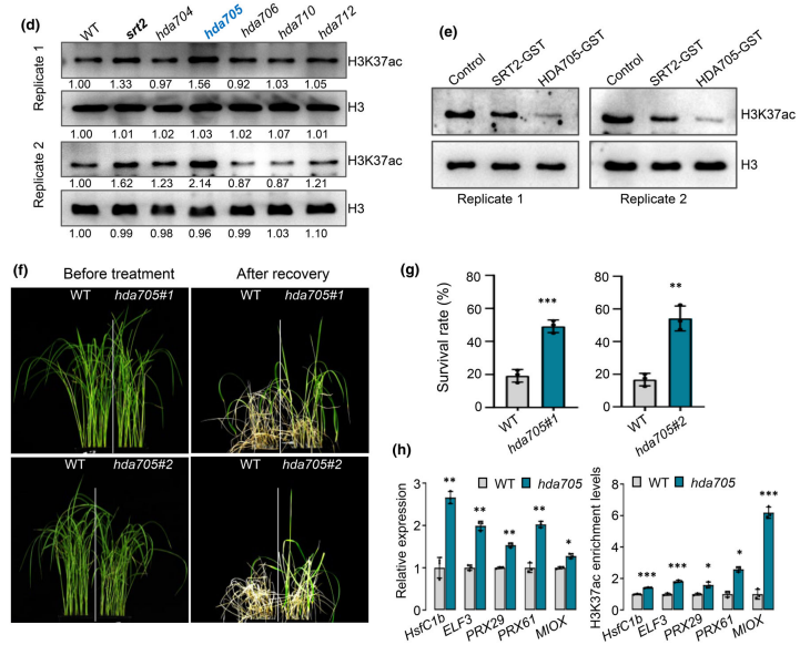 图1. 组蛋白去乙酰化酶HDA705通过介导H3K37ac乙酰化修饰调控水稻耐盐性