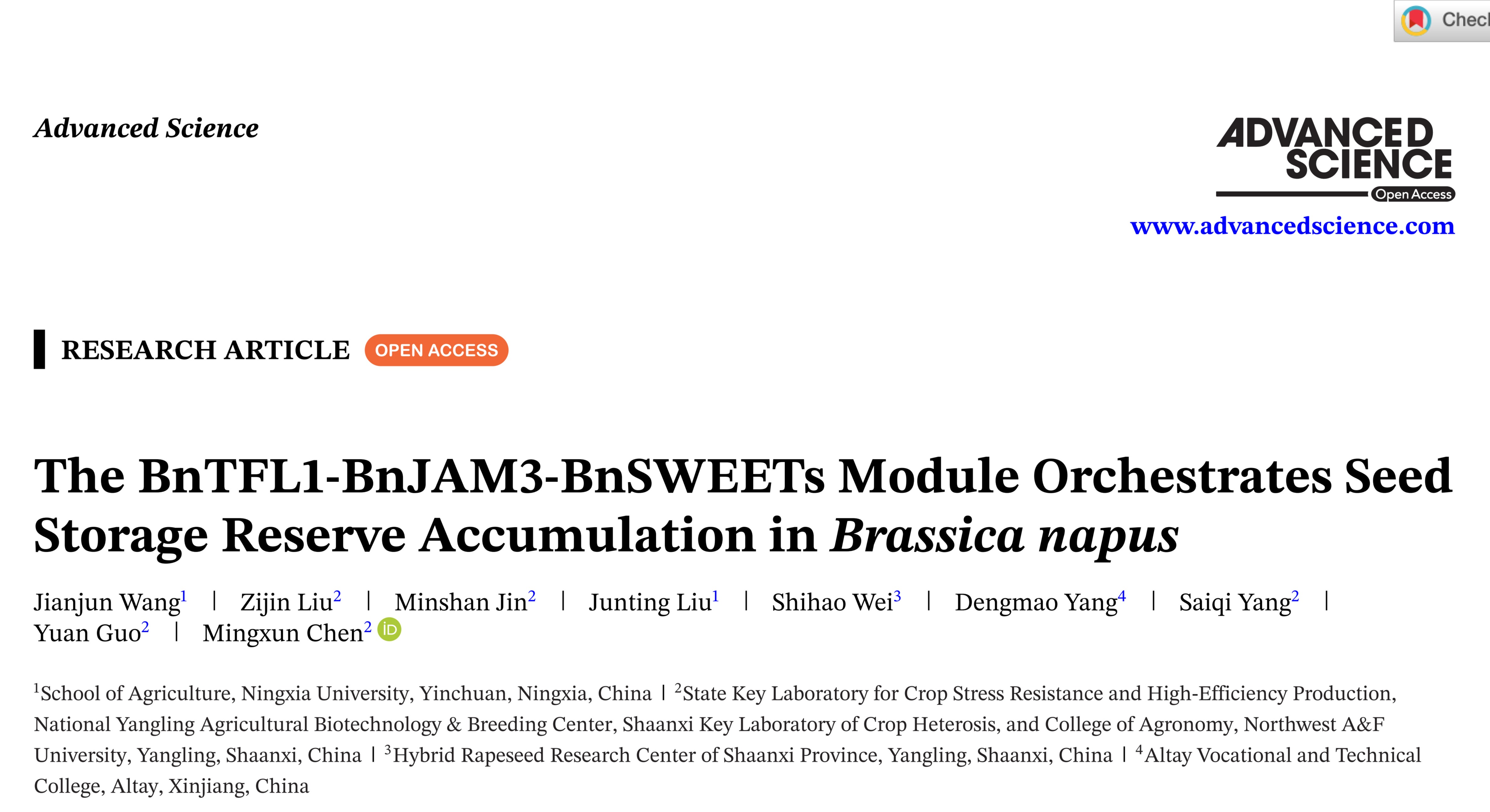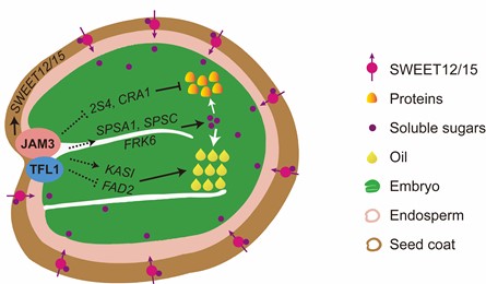 近日,重点实验室作物遗传育种方向的王建军博士与西北农林科技大学陈明训教授团队合作,在《Advanced Science》期刊发表题为“The BnTFL1-BnJAM3-BnSWEETs module orchestrates seed storage reserve accumulation in Brassica napus”的研究论文。该研究揭示了共转录因子BnTFL1与转录因子BnJAM3协同调控油菜种子可溶性糖、油脂与蛋白积累的分子机制,拓展了对种子油脂与蛋白等贮藏物质积累调控网络的新认知,为定向改良油菜种子油脂与蛋白合成提供了新靶标。